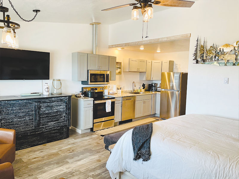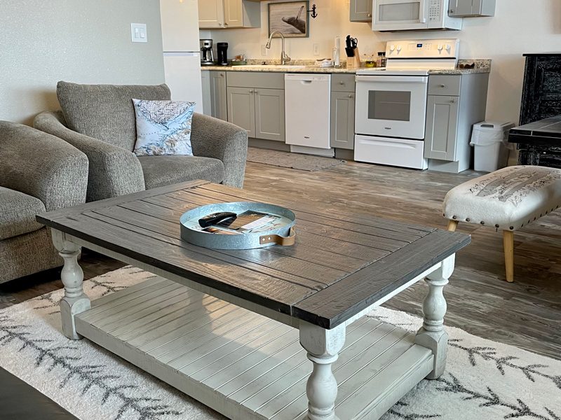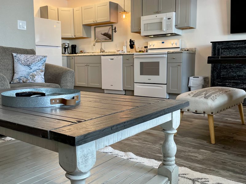 Our One Bedroom Suites are for the traveler that needs a little more elbow room and an ocean view. These Suites are what sets us apart from other hotels in Homer. Each bedroom houses both a luxurious King-sized bed and bonus Full-sized bed. Our living rooms all have sleeper sofas and a Murphy bed. Living rooms have smart flat screen HD TVs. Every Suite has a full kitchen with cooking items.