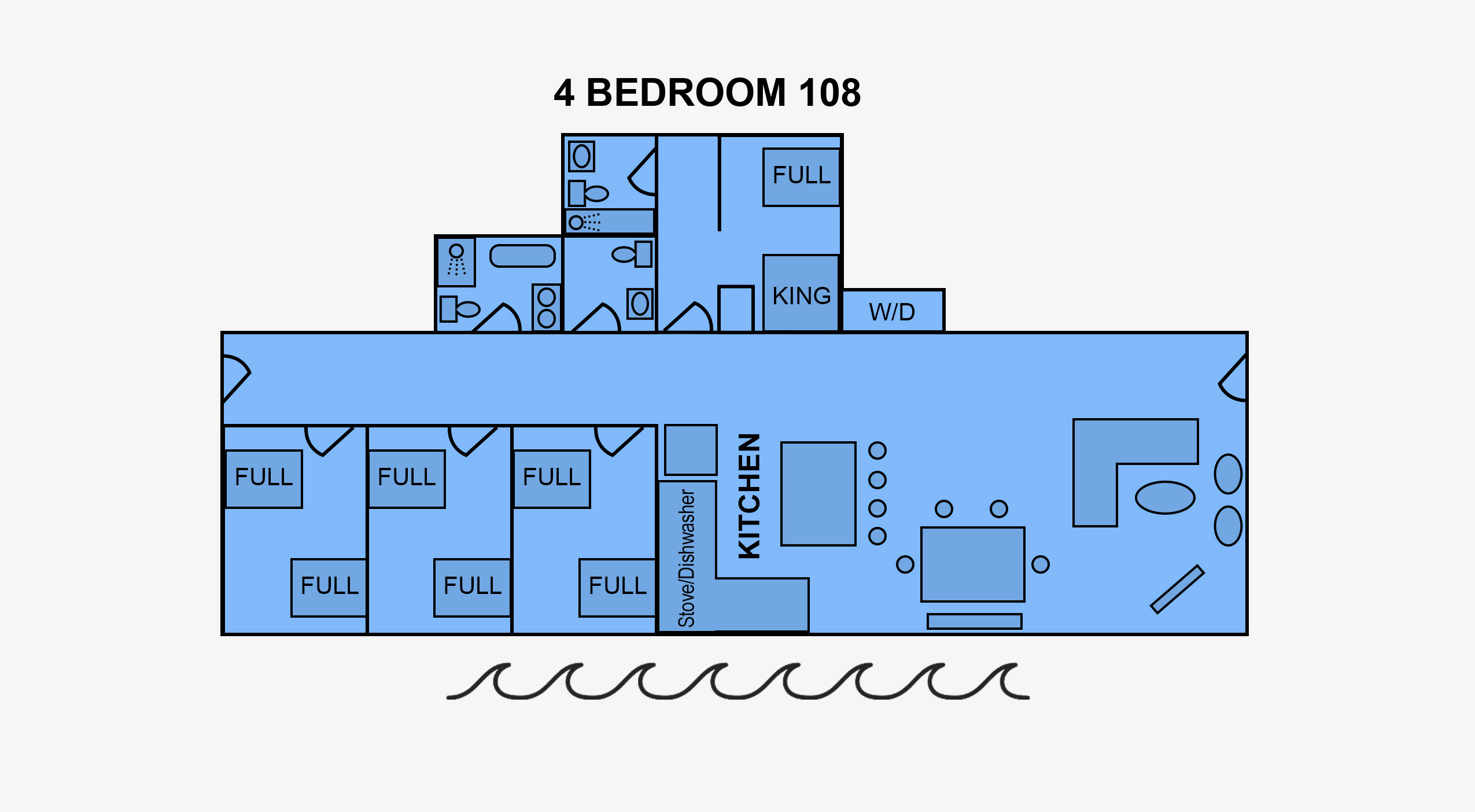 Our Three Bedroom Suites are an excellent choice to accommodate larger groups. The master bedroom offers both a luxurious King-sized bed and bonus Full-sized bed. The second bedroom has another King-sized bed for your comfort. The third bedroom features a Queen-sized bed and a half bath. Living rooms have smart flat screen HD TVs. Every Suite has a full kitchen with cooking items.
