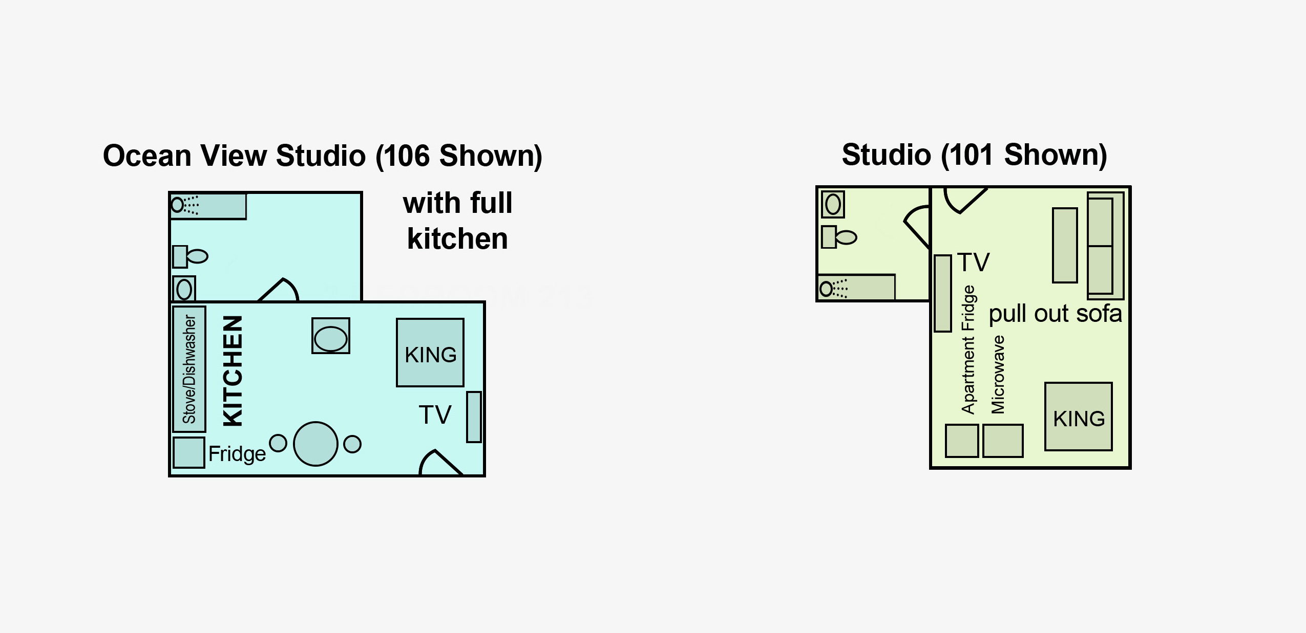 Our newly remodeled Studios offer either Ocean or Courtyard Views. All Studios feature open floor plans that include high-end comfortable beds, a private bathroom, and flat screen TVs. Ocean View Studios offer a full kitchen with range and dishwasher, and Courtyard View rooms offer a microwave, mini fridge, and coffee maker. Ice Maker and Coin Laundry are available on premises. All Studios offer the choice of a King-sized bed or 2 Full-sized beds.